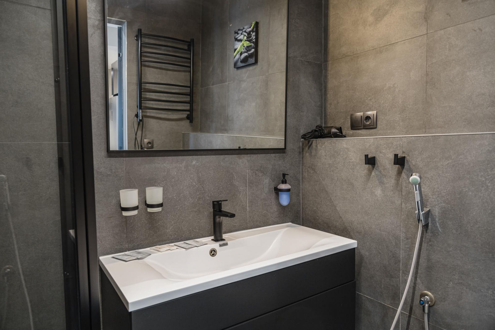 Апартаменты Premium с видом на море предоставят гостям максимальный комфорт и уют. Они отличаются стильным дизайном, удобством и функциональностью. Площадь номера: 45м.кв. Номер состоит из двух зон: спальня с двуспальной кроватью и гостиная с раскладным диваном. В апартаментах есть все необходимое для комфортного проживания: • Полностью оборудованная мини-кухня (индукционная электрическая плита, холодильник, электрочайник, микроволновая печь, шкаф с посудой, стол и стулья) • Раскладной диван • Система кондиционирования и встроенного отопления • LCD-телевизор • Сейф • Окна и двери с повышенной звукоизоляцией • Высокоскоростной Wi-Fi • Косметический набор • Меблированный балкон Номера расположены от первого до восьмого этажа. Номер отлично подходит для отдыха парой или семьи с детьми.