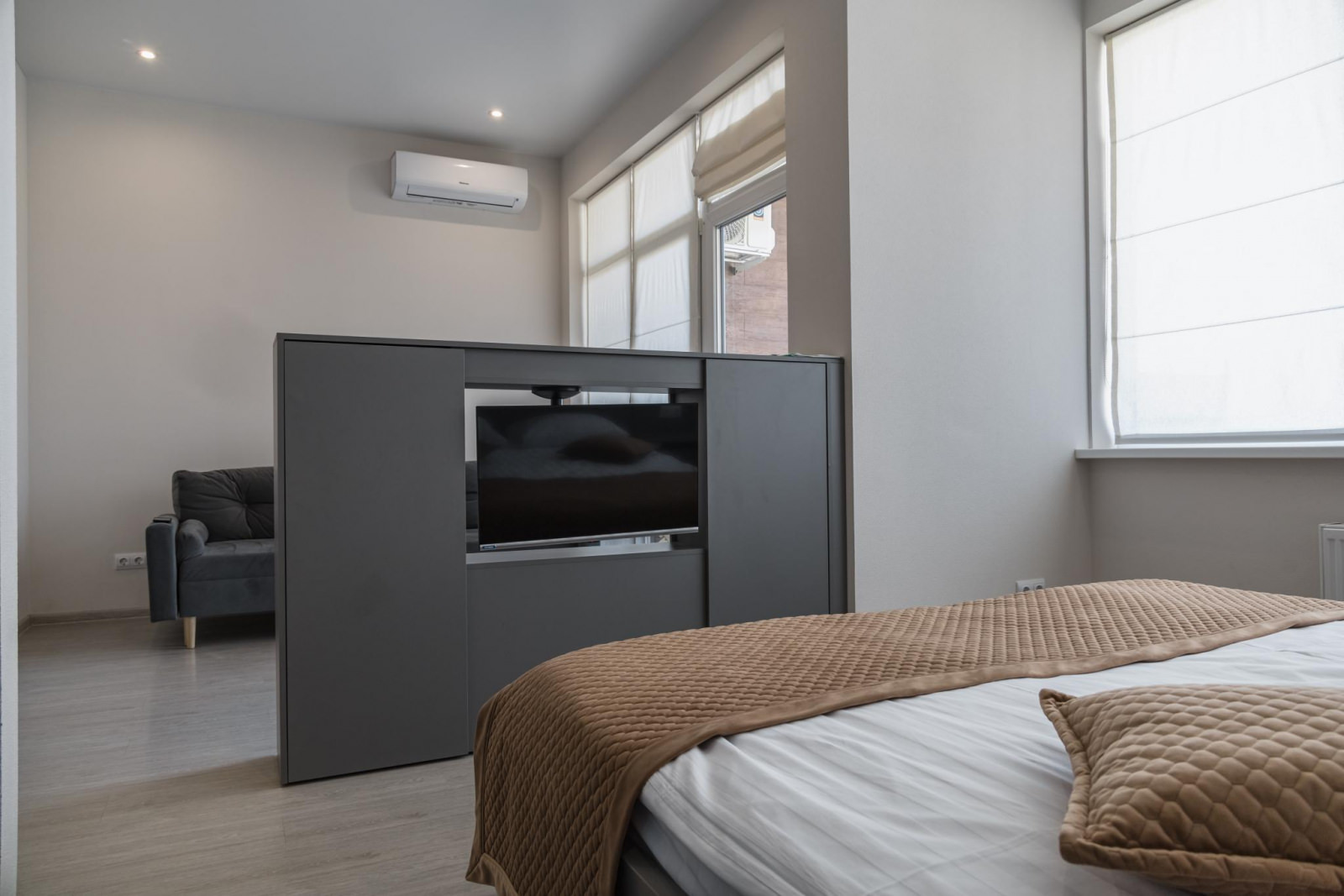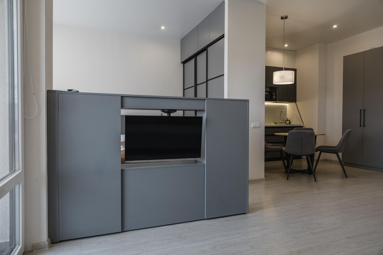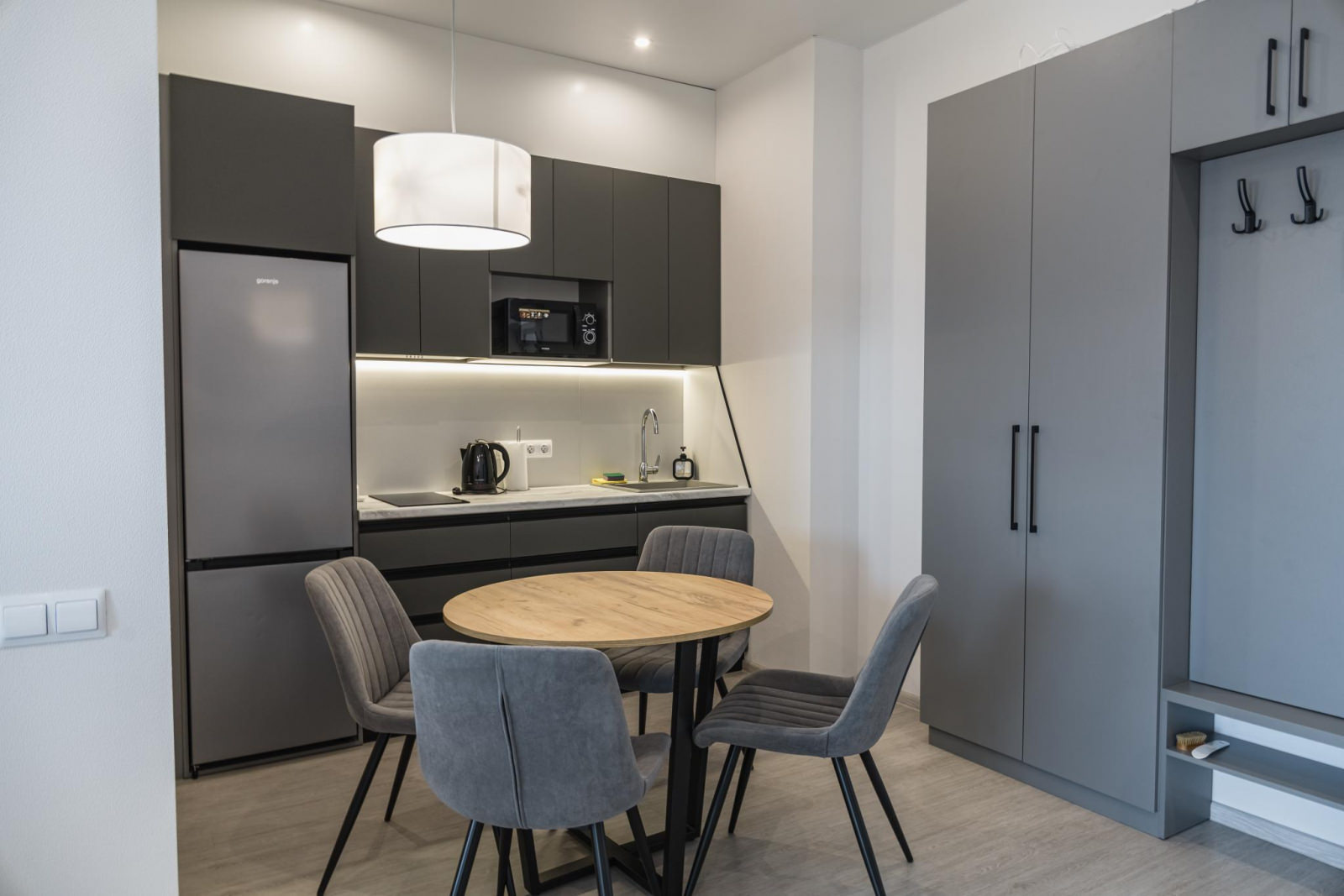 Однокомнатный номер с кухней рассчитан на 2 основных и 2 дополнительных места. Площадь номера: 45 кв.м. Основные места: одна двуспальная кровать. Дополнительное место:диван. Напольное покрытие: кафель и кварц-винил,линолеум. В каждом номере отеля: ортопедические матрасы, качественное постельное бельё и плотные шторы для комфортного сна и отдыха! Кухонный уголок с набором посуды. Номера расположены от первого до восьмого этажа. Из окон номера вид открывается либо на море, благоустроенную территорию или горный массив.