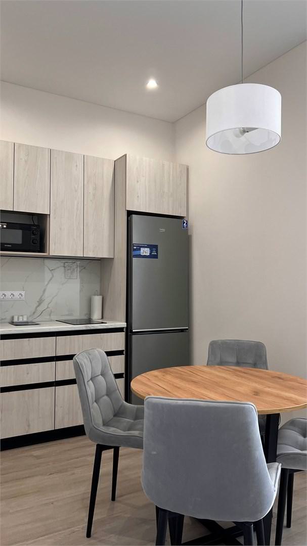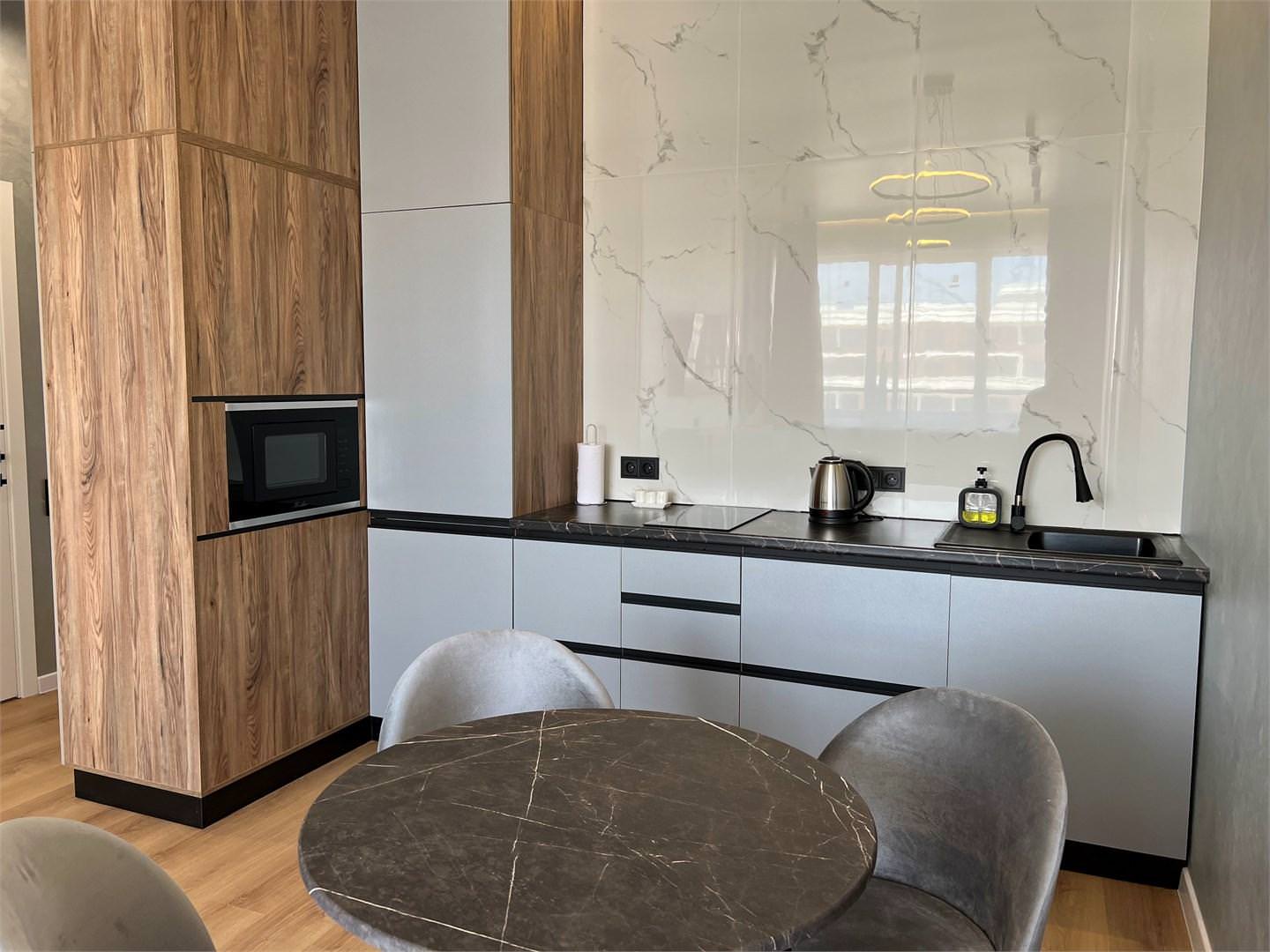 Двухкомнатный номер с кухней рассчитан на 2 основных и 2 дополнительных места. Площадь номера: 45 кв.м. Основные места: одна двуспальная кровать. Дополнительное место: диван. Напольное покрытие: кафель и кварц-винил, линолеум. В каждом номере отеля: ортопедические матрасы, качественное постельное бельё и плотные шторы для комфортного сна и отдыха! В апартаментах есть все необходимое для комфортного проживания: • Полностью оборудованная мини-кухня (индукционная электрическая плита, холодильник, электрочайник, микроволновая печь, шкаф с посудой, стол и стулья) • Раскладной диван • Система кондиционирования и встроенного отопления • LCD-телевизор • Сейф • Окна и двери с повышенной звукоизоляцией • Высокоскоростной Wi-Fi • Косметический набор • Меблированный балкон. Из окон номера вид на море. * Выполнение особых пожеланий не гарантируется * Апартаменты данной категории могут отличаться дизайном интерьера